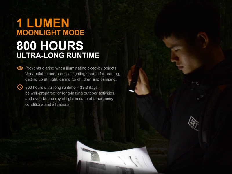 Svetilka ima CREE XP-L HI V3 LED z življenjsko dobo 50.000 ur in Li-Ion 3V / 3500 mAh akumulatorjem, brez pozitivnega in negativnega pola, zaščiten proti prenapolnitvi, preizpraznitve in preobremenitviji. Izdelana iz anodiziranega letalskega aluminija. Vodoodporna po standardu IPX-8. Svetilka ima ojačano ultra-čisto dvojno lečo z anti - reflektivno prevleko proti odsevu in Premium Type III anodiziran premaz proti rjavenju. Prav tako ima elektronsko regulirano svetilnost in ročaj iz nedrsečega materiala.