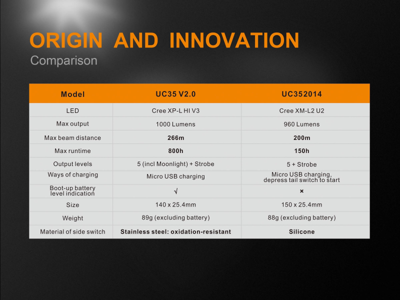 Prenovljena akumulatorska ročna svetilka Fenix UC35 odlikuje kompaktna izvedba in vrhunska svetilnost 1000 lumnov (kot dolge avtomobilske luči). Svetilko polnite s priloženim Micro-USB polnilcem.